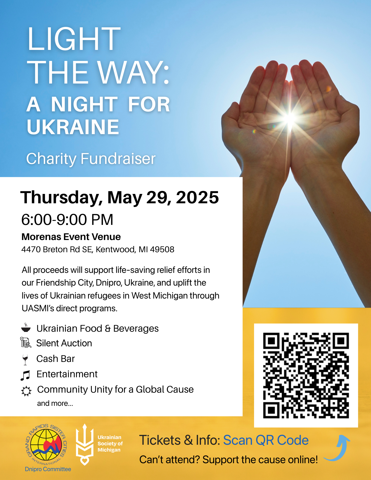 The Ukrainian Society of Michigan and the Dnipro Committee of Grand Rapids Sister Cities International invite the West Michigan community to an evening of local-global solidarity. Proceeds will deliver life-saving medical aid in Ukraine and fund mental-health support, translation services, and job-navigation programs for displaced Ukrainians resettling in our region.