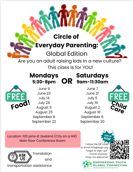 Empowering Youth Global Connection welcomes parents, guardians, and anyone in a parent-like role who is raising children in a culture different from their own—Newcomers, New Americans, immigrants, and refugees alike. Each session offers practical tools, shared stories, and a supportive community. Complimentary dinner, on-site childcare, and assistance with transportation and translation make participation easy.