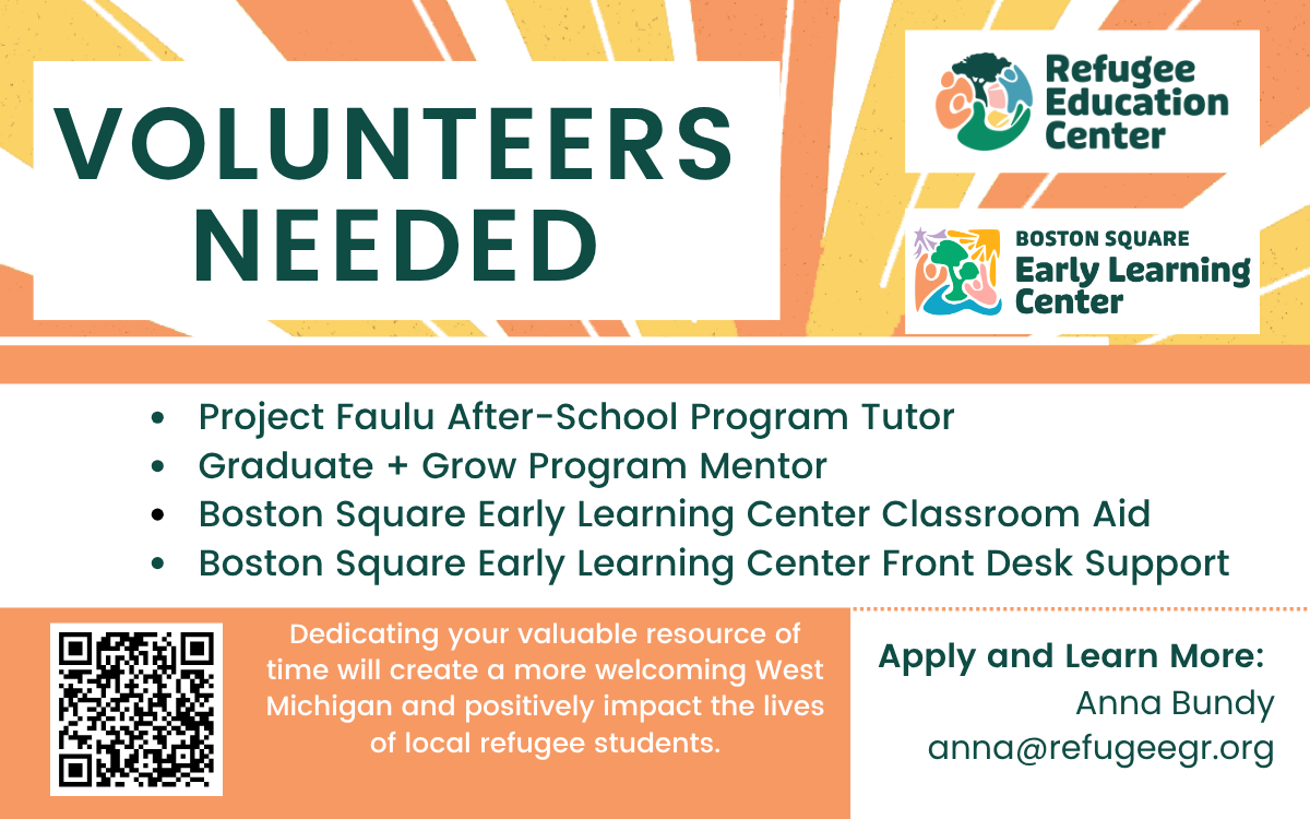 📩 Get Involved: Visit refugeeGR.org/volunteer to review available opportunities and complete the volunteer interest form, or contact Anna Bundy at anna@refugeegr.org for more information.