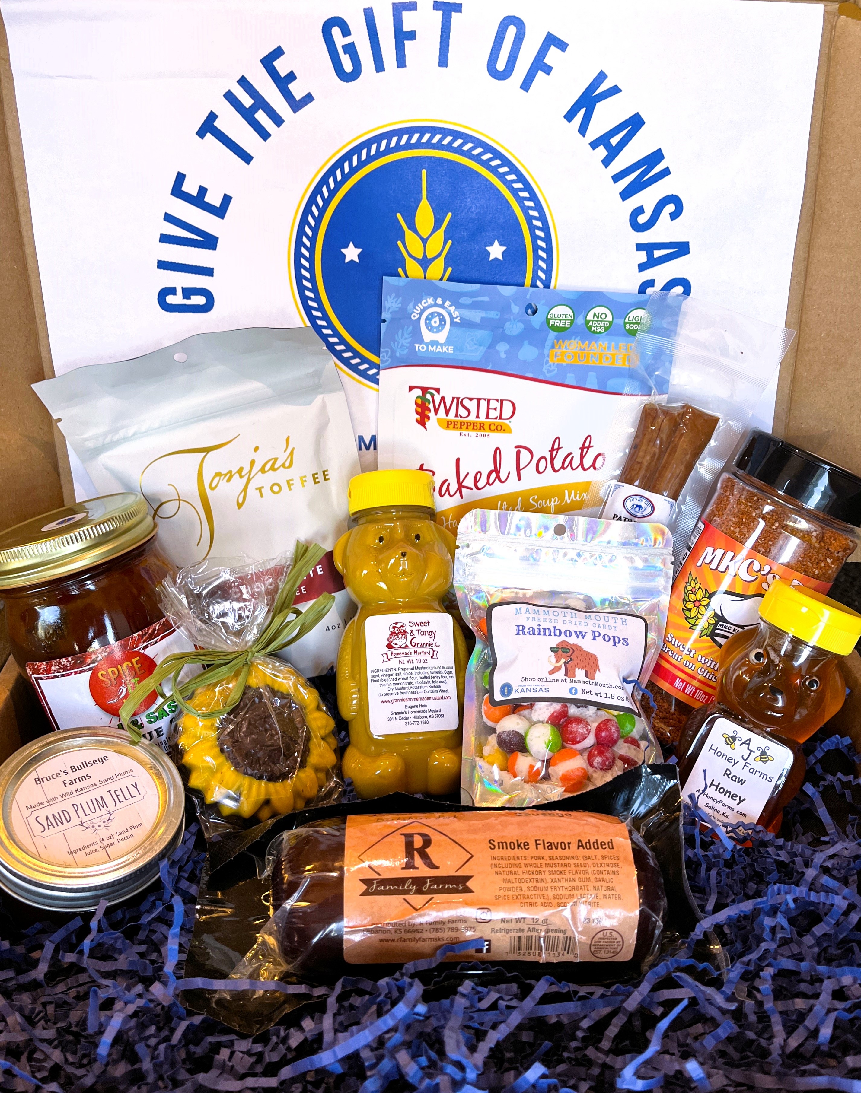 The 2024 holiday gift box contains: Honey (AJ Honey Farms in Salina); Beef Sticks (Pat's Beef Jerky from Liebenthal); MKC's Rub (MKC Kitchen LLC in Bazine); Sweet & Tangy Mustard (Grannie's Homemade Mustard from Hillsboro); Mild and Sassy BBQ Sauce (Spice It Up from Bonner Springs); Baked Potato Soup Mix (Twisted Pepper in Wichita); Sand Plum Jelly (Bruce's Bullseye Farms in Leon); Summer Sausage (R Family Farms in Lebanon); Rainbow Pops Freeze-Dried Candy (Mammoth Mouth in LaCygne); Chocolate Sunflower (Sweet Granada in Emporia); and Milk Chocolate Toffee (Tonja's Toffee in Leoti).