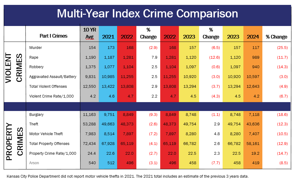 Find the full 2024 Kansas Crime Index report, and previous year’s statistics at: KBI - Kansas Bureau of Investigation - Statistics - Crime Statistics.