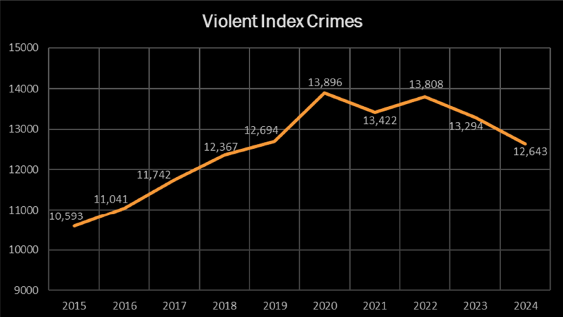 The 2024 Kansas Crime Index Report indicated that violent crime in Kansas decreased by 6.7% from 2023. A total of 12,643 crimes were reported for the offenses of murder, rape, robbery, and aggravated assault and battery. With this decline, violent crime in the state was equal to the 10-year average.
