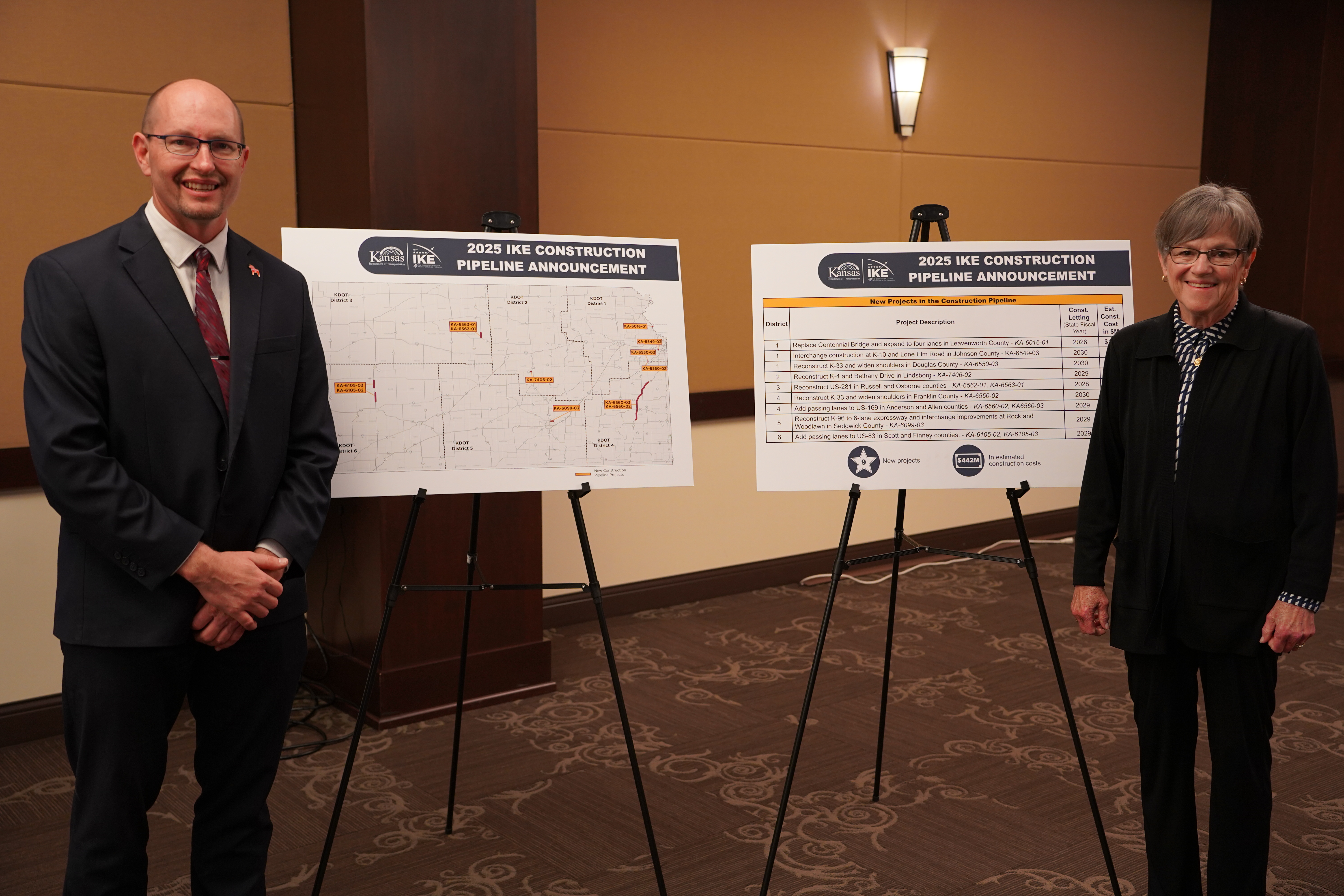 TOPEKA – Governor Laura Kelly and Kansas Department of Transportation (KDOT) Secretary Calvin Reed today announced in Lindsborg nine new modernization and expansion highway projects. These projects, which represent a total investment of more than $442 million, are moving into the Eisenhower Legacy Transportation Program (IKE) construction pipeline. This is the fourth round of projects moved to KDOT’s construction pipeline under the Kelly administration’s bipartisan 10-year IKE program.