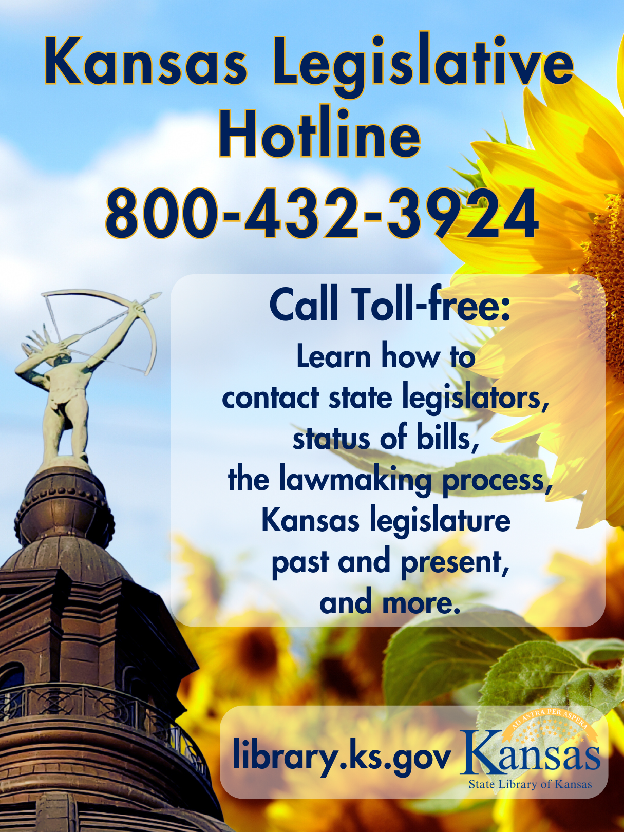 TOPEKA–Kansans are encouraged to call the Legislative Hotline, 1-800-432-3924, for information about the 2026 Kansas Legislature and legislative sessions, as well as past sessions. Kansas’ Legislative Hotline can also be accessed by emailing library@ks.gov or using the chat online, library.ks.gov/chat. The Legislative Hotline is a trustworthy resource for state residents with questions about the Kansas Legislature and is staffed by skilled librarians.