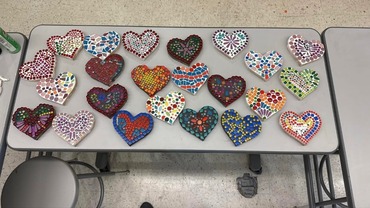 Our talented KSD high school students created these heart-shaped mosaics, each reflecting their creativity and attention to detail. Using colorful tiles, beads and glass pieces, students designed unique patterns ranging from bold geometrics to nature-inspired themes.