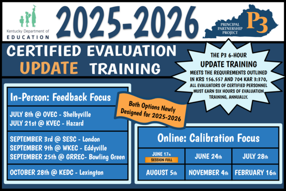 The 6-hour P3 Certified Evaluation UPDATE training meets the requirements outlined in 704 KAR 3:370 and KRS 156.557 that all EXPERIENCED EVALUATORS must attend a 6-hour EILA-approved training, annually.