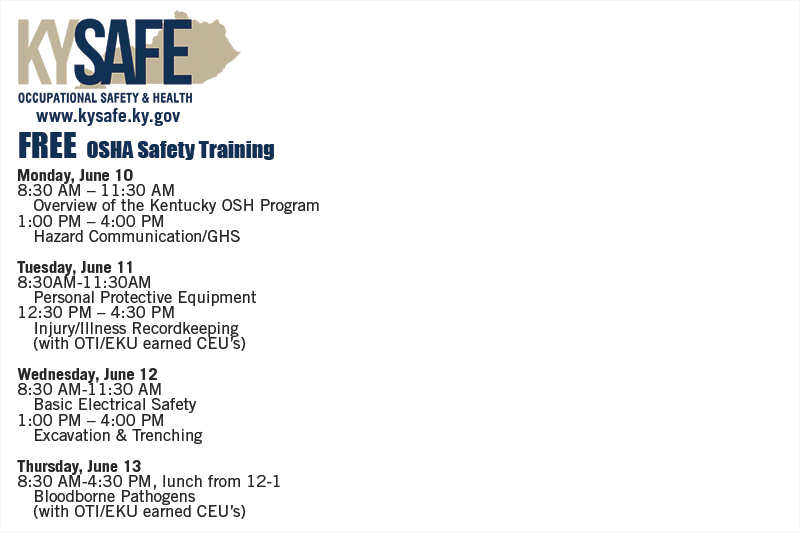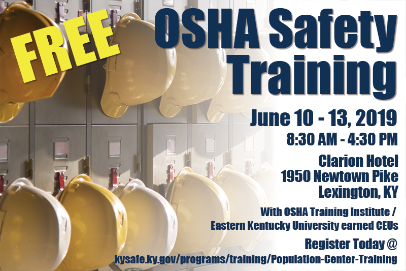 FRANKFORT, Ky. (May 14, 2019) – Free OSHA Safety Training is coming to the Lexington, KY area on June 10-13, 2019. Classes will be held 8:30am - 4:30pm each day. These free classes will be located at the Clarion Hotel, 1950 Newtown Pike, Lexington, KY. For more information and to register for this free training event, please click here.
