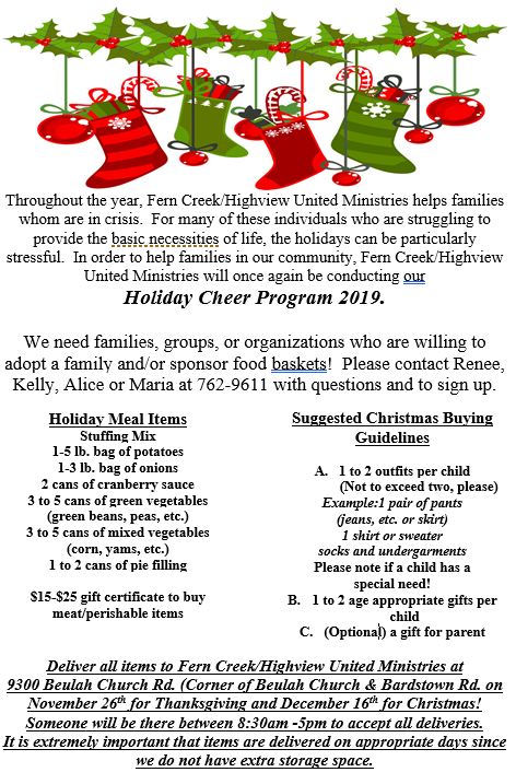 Food Donations for Fern Creek/Highview United Ministries will be accepted to help feed the needy.