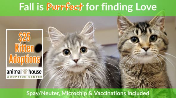 Purr Alert! Kittens have taken over the Pussycat Lounge at Animal House Adoption Center. Help restore order by adopting any kitten for a $25 donation. Spay/Neuter, microchip and vaccinations are included. Or adopt a pair for just a $50 donation. Calico, tabby, tuxedo, or Bengal – we’ve got the purrfect kitten for you. Animal House, located at 3516 Newburg Road, is open from 12:00-6:00pm daily. No appointment needed, walk-ins are always welcome!