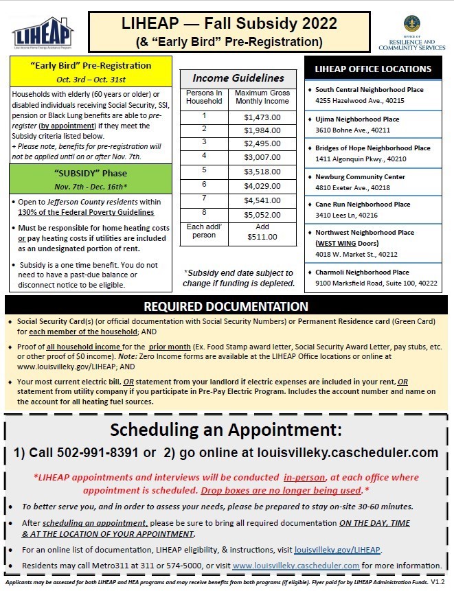 Eligibility for MSD’s Emergency Wastewater Rate Assistance Program (EWRAP) is limited to households at or below 150 percent of federal poverty guidelines. RCS will handle a one stop application process covering both EWRAP and the Low-Income Home Energy Assistance Program (LIHEAP). That means applicants will submit documentation only once instead of having to go through separate processes for wastewater discounts and energy assistance. RCS will also take applications for the MSD Senior Citizen Discount Program. New this year, seniors already receiving the discount must recertify eligibility each year before the anniversary of their previous approval date by filing a new application. The program provides a 30 percent discount for customers age 65 and above with gross household incomes of less than $35,000. Seniors may also continue to apply directly with MSD at louisvillemsd.org/paymybill. EWRAP is approved for the period of October 1, 2022 through September 30, 2023. The MSD Board will decide each year whether to continue the program. Jefferson County MSD customers can make appointments for LIHEAP registration and EWRAP application by phone at 502-991-8391 or online at louisvilleky.cascheduler.com. ![]() LIHEAP Fall 2022![]() Learn more at louisvilleky.gov/liheap. Crime Maps - Updated Daily