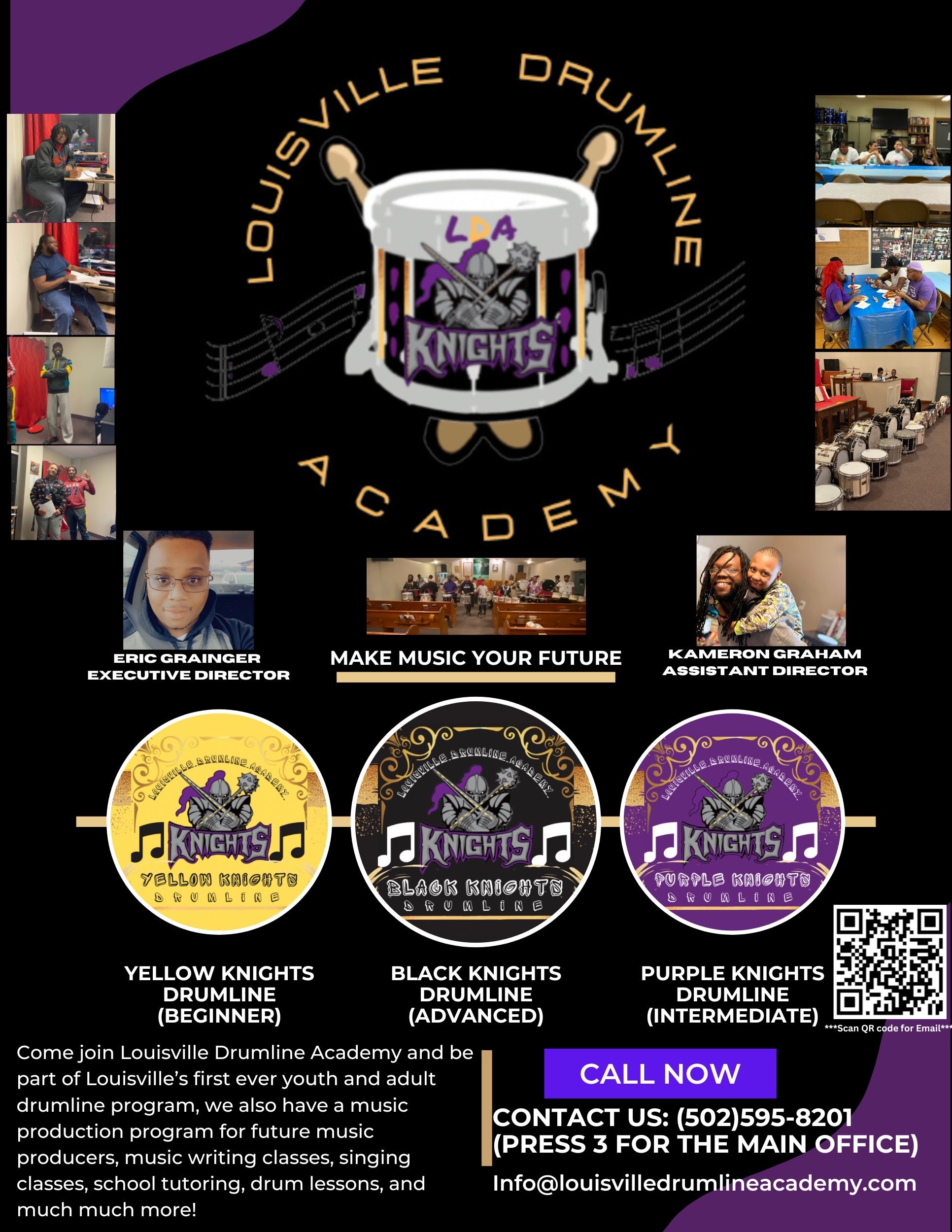 Louisville Drumline Academy is a program where children and adults ages 4-35 can express their creativity thru arts and music, and also teach the concepts or music, arts, and other discipline thru our many programs. Our goal is to prevent violence in the city of Louisville and our surrounding neighbors that includes: Lexington, Ky, Bowling Green, Ky, Cincinnati, Oh, Jeffersonville, In, Clarksville, In , New Albany, In and looking to serve many more states and help them cites stop the life of crime and violence with our musical sources. To learn more, click here.
