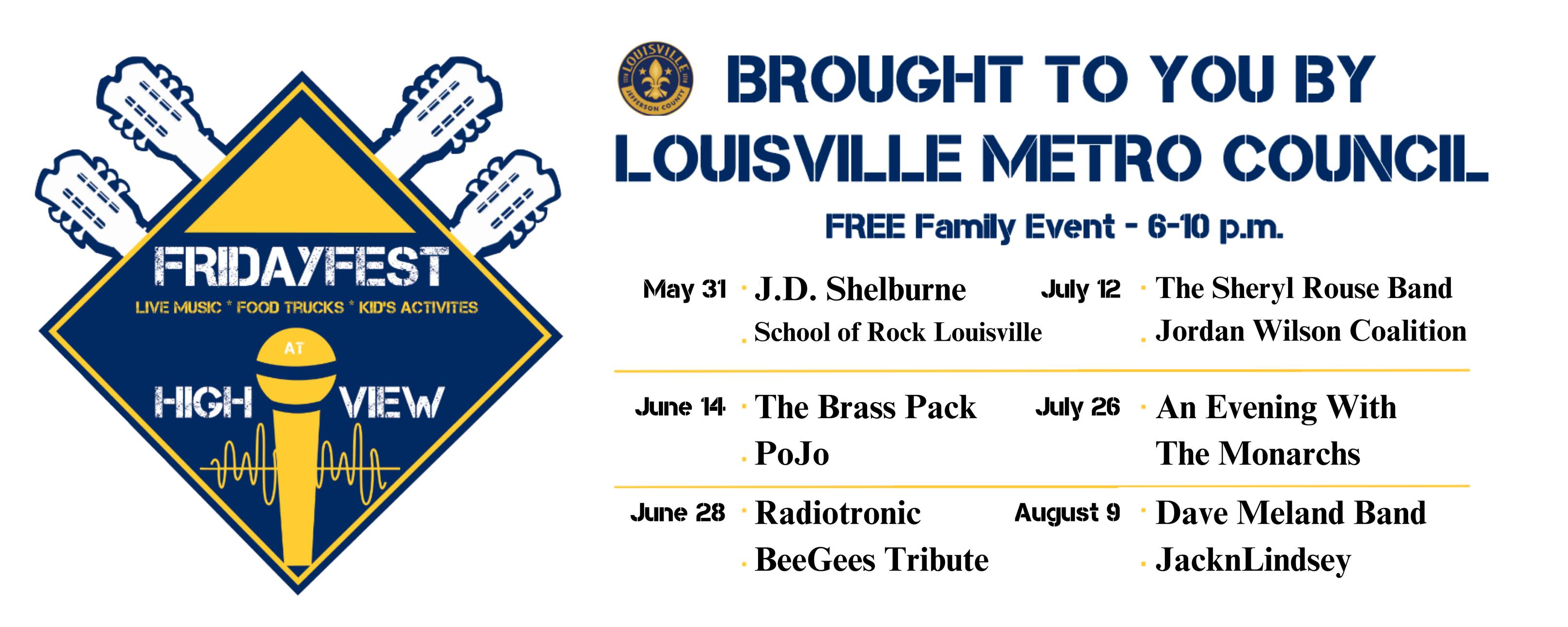 The FridayFest concert series will return for its twelfth year this summer at Highview Park. This is a series of six concerts offering a variety of music on Fridays, as well as various food vendors and children’s activities.