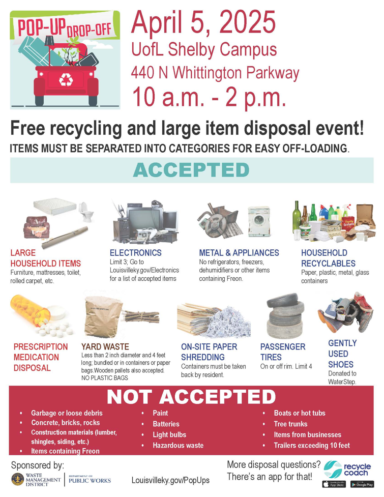 Louisville Metro Solid Waste Management will be hosting various free recycling and large item disposal events throughout 2025. All events are from 10 am to 2 pm on select Saturdays: