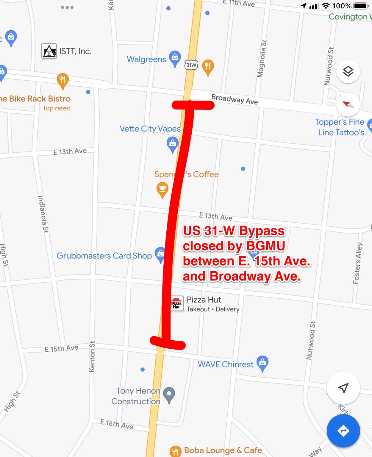 BOWLING GREEN, Ky. (Sept. 7, 2022) – A Bowling Green Municipal Utility (BGMU) project will temporarily close a section of the U.S. 31-W Bypass in Bowling Green next week. The U.S. 31-W Bypass will close between U.S. 231 Broadway Avenue and E. 15 Avenue beginning Monday, Sept. 12 at 6 a.m. The roadway is expected to open by the afternoon of Friday, Sept. 23. The work schedule is weather dependent.