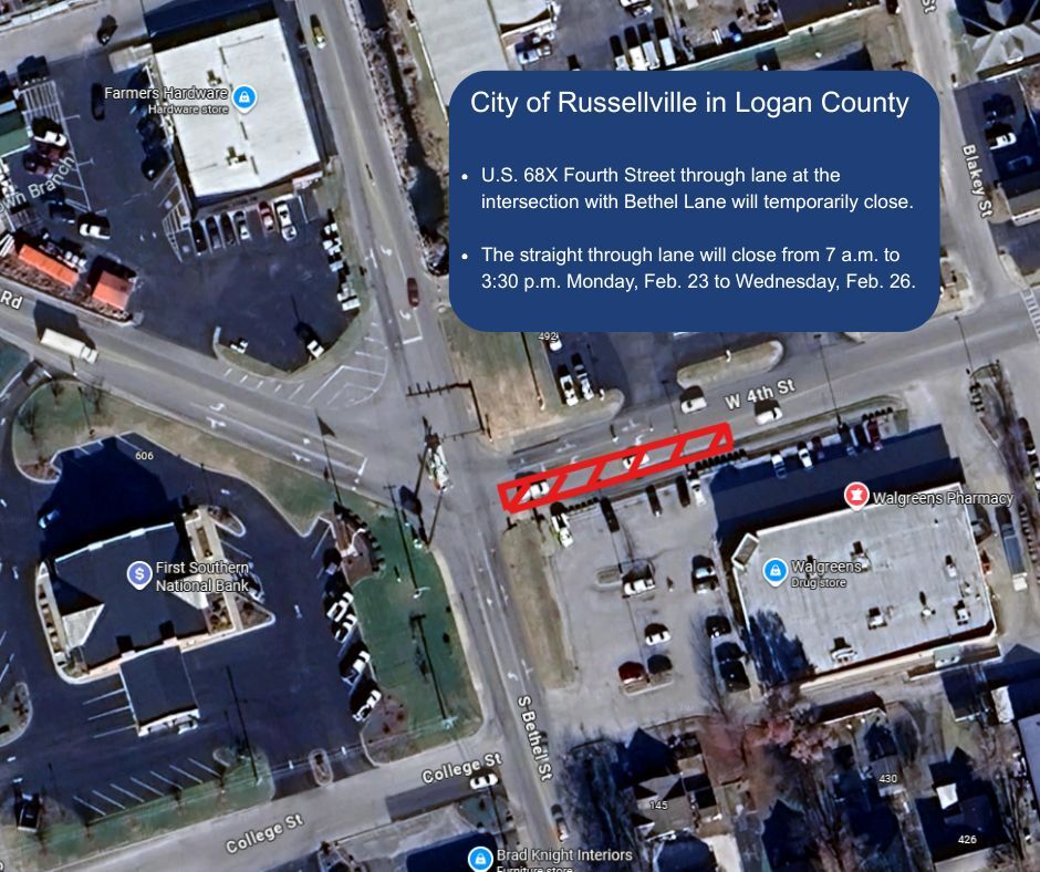 BOWLING GREEN, Ky. (Feb. 18, 2026) — A section of U.S. 68X Fourth Street in the city of Russellville in Logan County is set for a temporary closure. The eastbound through lane of U.S. 68X will be closed at the intersection with Bethel Street beginning Monday, Feb. 23. The closure will take place between 7 a.m. and 3:30 p.m. through Wednesday, Feb. 25. All other lanes will remain open.