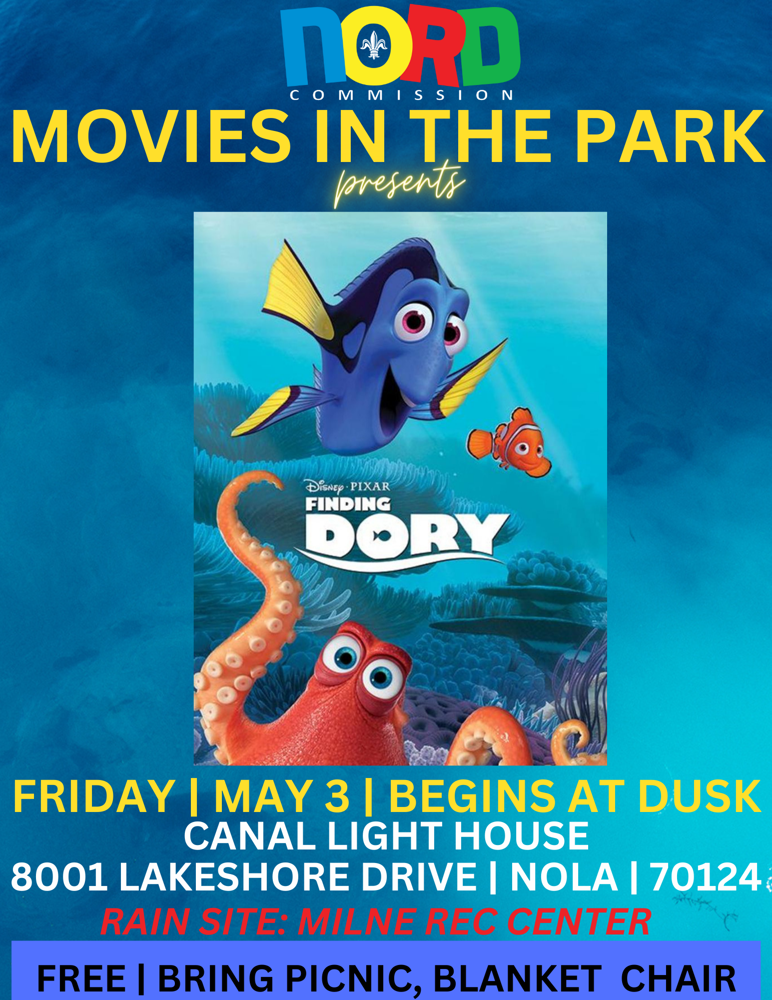Please come out tonight, NORD presents...'Finding Dory' Movie at Canal Light House, 8001 Lakeshore Drive! Movie begins at dusk! See you tonight!