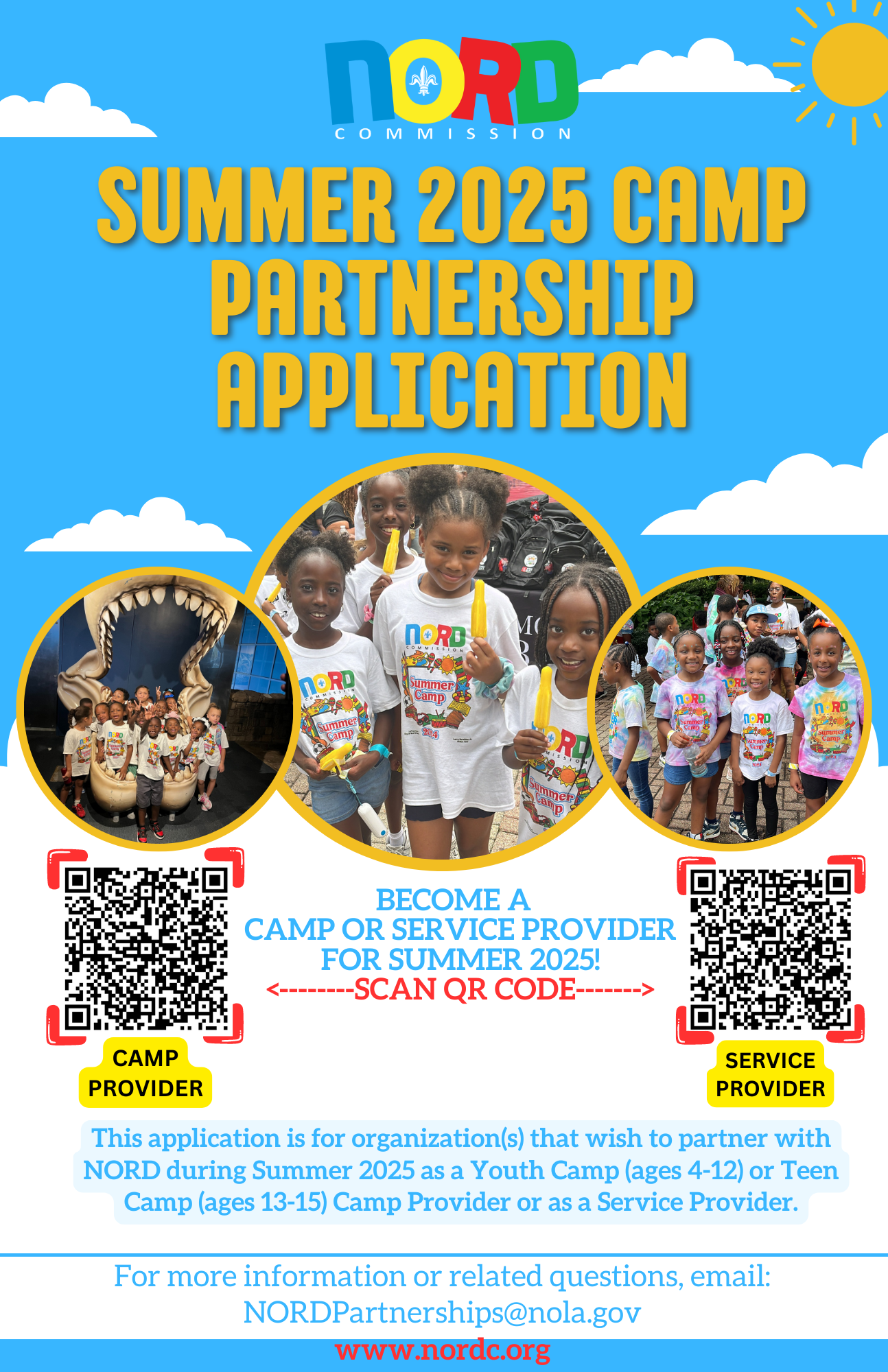 Would you like to be one of our Summer 2025 Partners!? We're now accepting Partnership Applications for our Summer 2025 Programming! Application deadline: Wednesday, November 20, 2024 at 5:00pm. **For questions about the application or the submission process, applicants may email NORDpartnerships@nola.gov. Scan QR Codes for application(s).