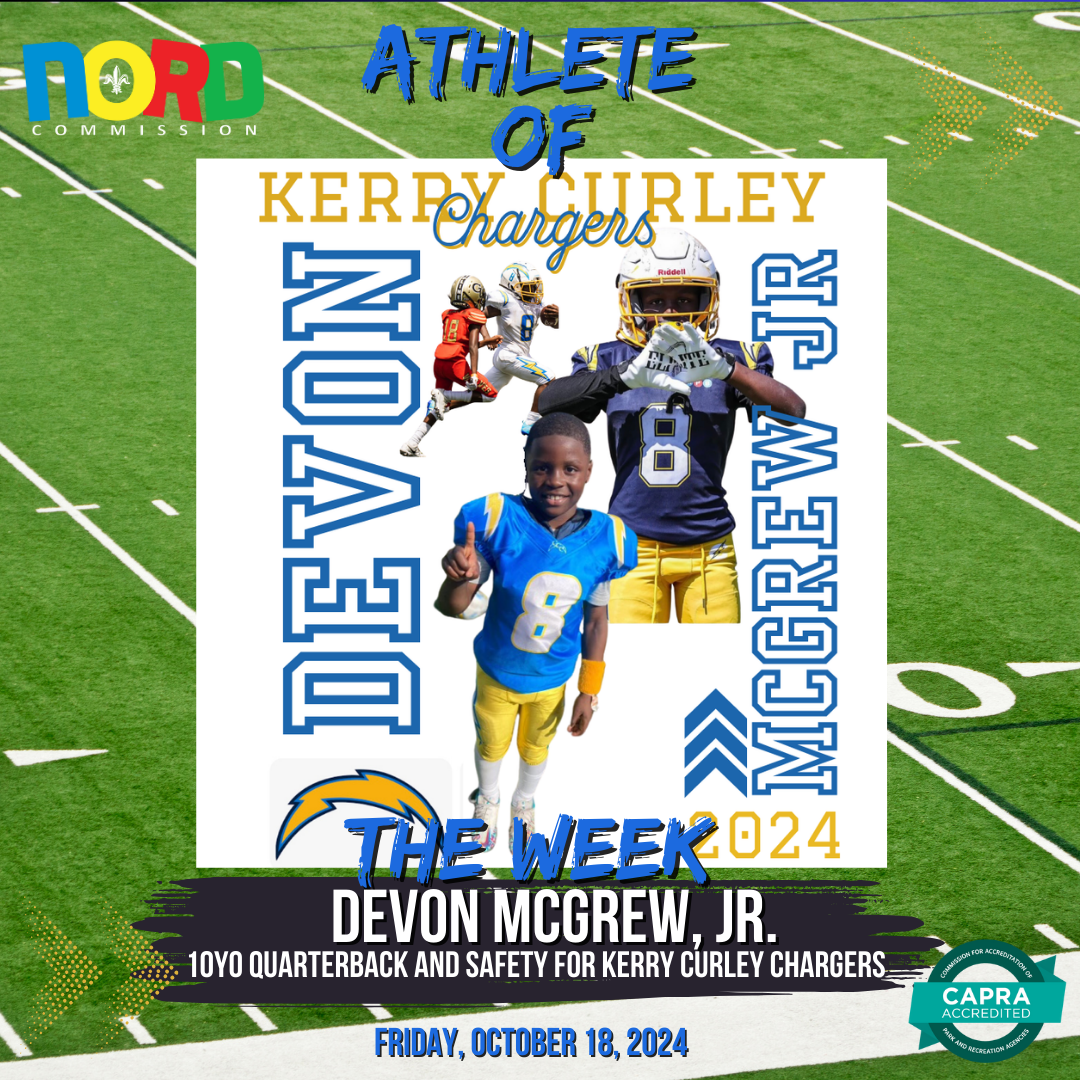 NORD is proud to announce Devon 'Muscle' McGrew, Jr. as this week’s Athlete of the Week. Devon, 10 years old, plays quarterback and safety for the Kerry Curley, Devon had 4 tackles, ran for 3 touchdowns and threw for another in a dominating performance; leading the Kerry Curley Chargers to victory against the Willie Hall Panthers in a crucial Division I matchup. As a 5th grader at KIPP Morial School, Devon also participates in basketball, baseball, and track. His favorite athlete is Shohei Ohtani. Congratulations to Devon for his outstanding performance and contributions on the field. We look forward to continuing to celebrate the achievements of more talented young athletes throughout the season. For more information on NORD Athletics, please visit www.nordc.org or call (504) 658-3012. GO KERRY CURLEY CHARGERS!!!