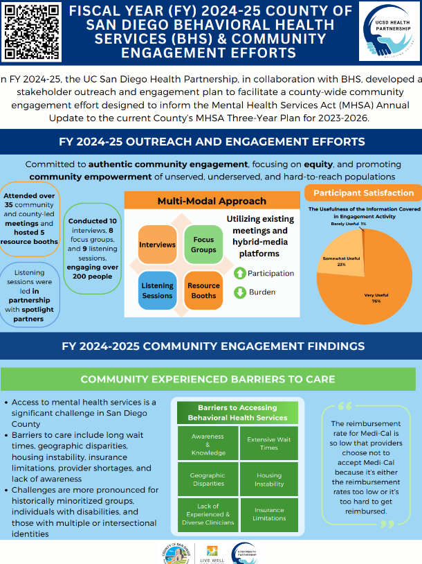 The UCSD Health Partnership, in collaboration with San Diego County Behavioral Health Services (BHS), launched a community-wide engagement effort to inform updates to the Mental Health Services Act (MHSA) Three-Year Plan (2023–2026). Over 200 individuals participated through interviews, focus groups, listening sessions, and resource booths, highlighting barriers like long wait times, geographic disparities, lack of awareness, housing instability, and provider shortages.