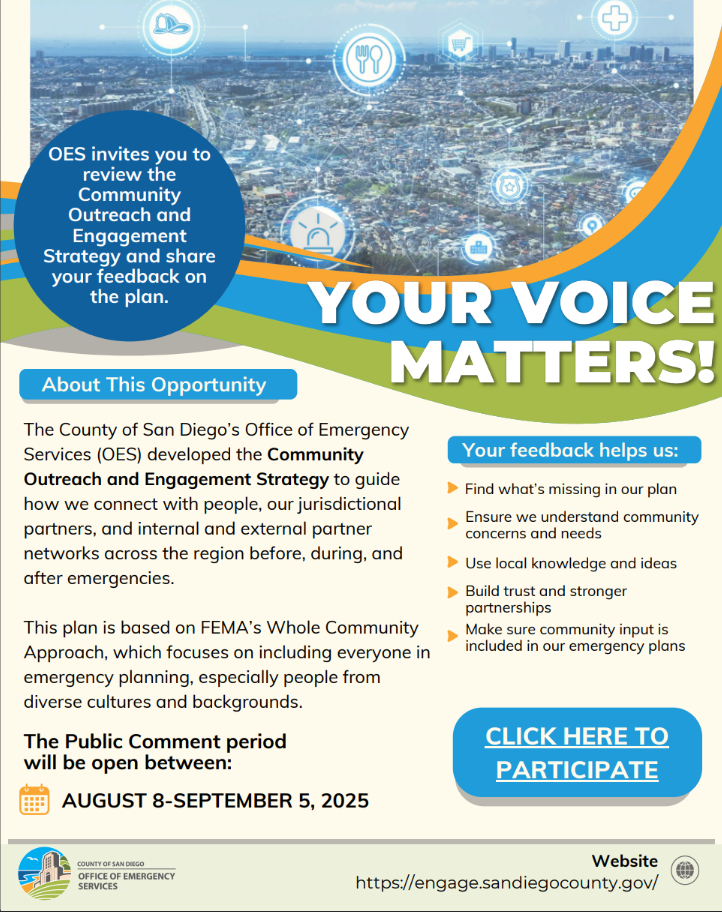 The County of San Diego’s Office of Emergency Services (OES) is seeking community input on its draft Community Outreach and Engagement Strategic Plan. The plan guides how OES connects with residents before, during, and after emergencies, using FEMA’s Whole Community Approach to ensure inclusive, community-driven planning.