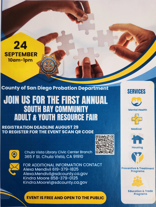 A community-focused event aimed at connecting justice-involved individuals and residents with vital local resources. Hosted by the San Diego County Probation Department, this fair brings together service providers, organizations, and community members to promote access, support, and opportunity.