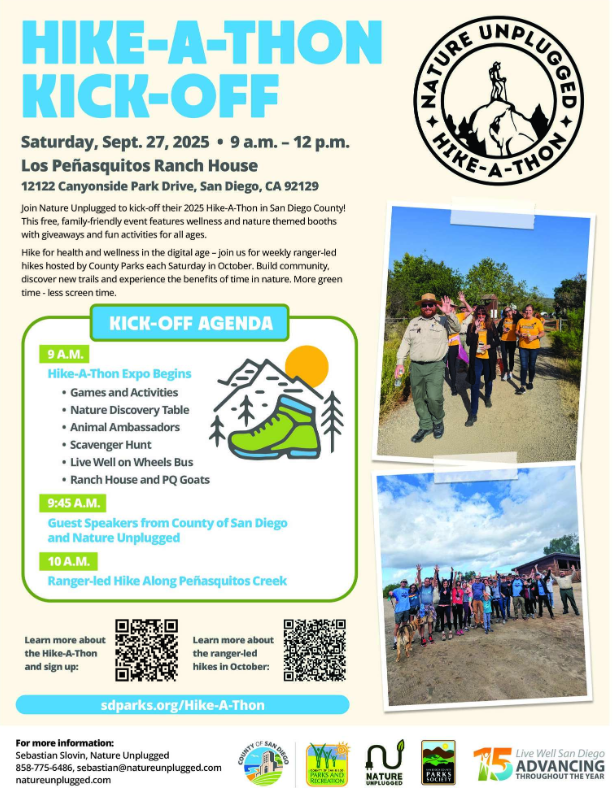 Join Nature Unplugged to kick-off their 2025 Hike-A-Thon on Saturday, September 27! This free, family-friendly event features wellness and nature themed booths with giveaways and fun activities for all ages. Following the kick-off event, hike for health and wellness in the digital age throughout October – join weekly ranger-led hikes hosted by County Parks every Saturday. Build community, discover new trails and experience the benefits of time in nature.