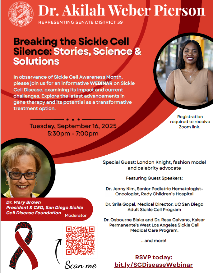 In observance of Sickle Cell Awareness Month, please join for Dr. Akilah Weber Pierson and Dr. Mary Brown for an informative webinar on sickle cell disease.