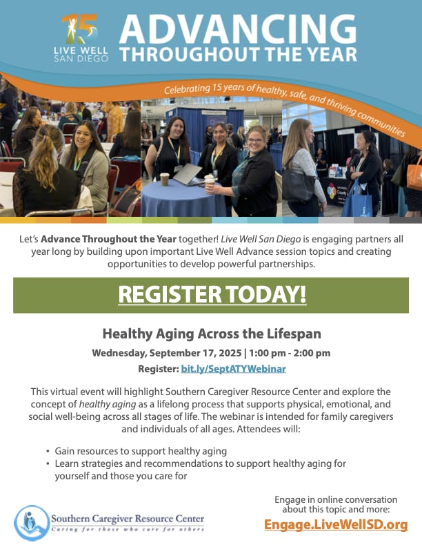 This virtual event will highlight Southern Caregiver Resource Center and explore the concept of healthy aging as a lifelong process that supports physical, emotional, and social well-being across all stages of life. The webinar is intended for family caregivers and individuals of all ages.