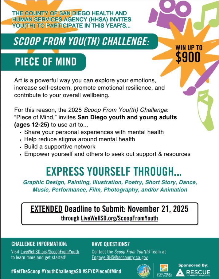 The County of San Diego Health and Human Services Agency (HHSA) invites San Diego youth and young adults (ages 12–25) to participate in the 2025 Scoop From You(th) Challenge: “Piece of Mind.” This challenge encourages participants to use art to explore emotions, increase self-esteem, promote emotional resilience, and support overall wellbeing.