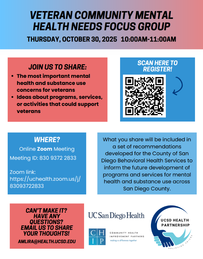 UCSD Health Partnership is gathering community input to shape San Diego County Behavioral Health Services recommendations. Service providers, community members and advocates are invited to share your thoughts and experiences around mental health and substance use.