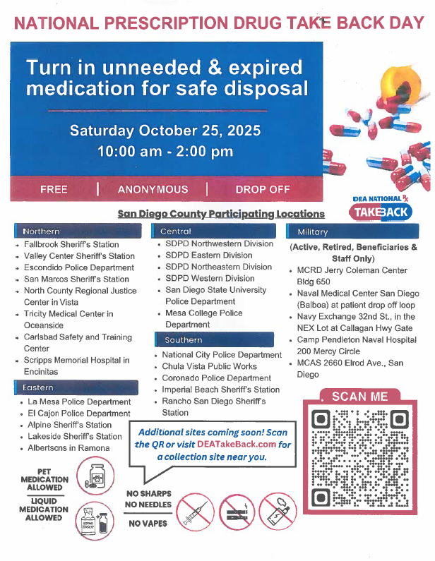San Diego County is hosting numerous participating locations across Northern, Central, Southern, Eastern, and Military divisions. The event accepts pet medication and liquid medication but strictly prohibits sharps, no sharps, and vapes.