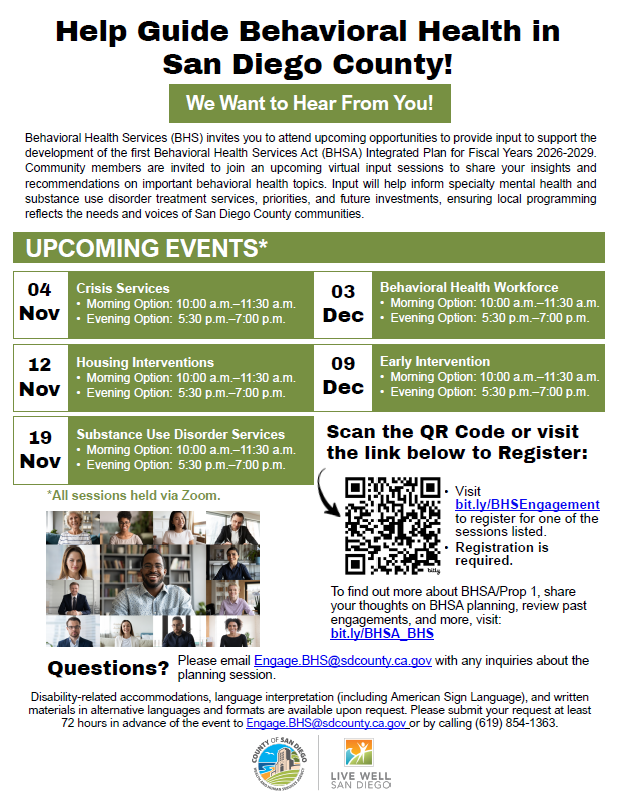 Behavioral Health Services (BHS) invites community members to virtual input sessions this November and December 2025 to help shape the BHSA Integrated Plan for FY 2026–2029. These Zoom sessions, offered morning and evening, will gather public feedback to guide mental health and substance use priorities and investments in San Diego County.