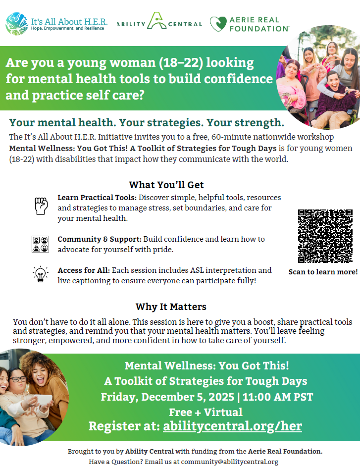 The It’s All About H.E.R. Initiative offers a free workshop for young women (18–22) with disabilities that impact how they communicate with the world. Participants will learn practical tools to manage stress, set boundaries, and care for their mental health, while building confidence and self-advocacy skills. Each session includes ASL interpretation and live captioning to ensure full access for everyone.
