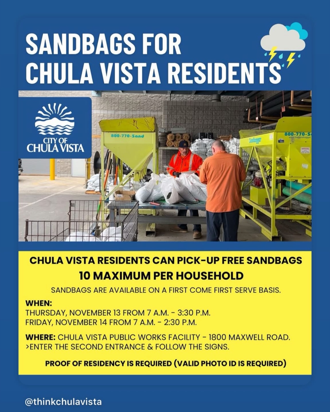 Chula Vista residents can pick up free sandbags to help prepare for rainy weather. Each household may receive up to 10 sandbags, available on a first-come, first-served basis while supplies last. Proof of residency is required.