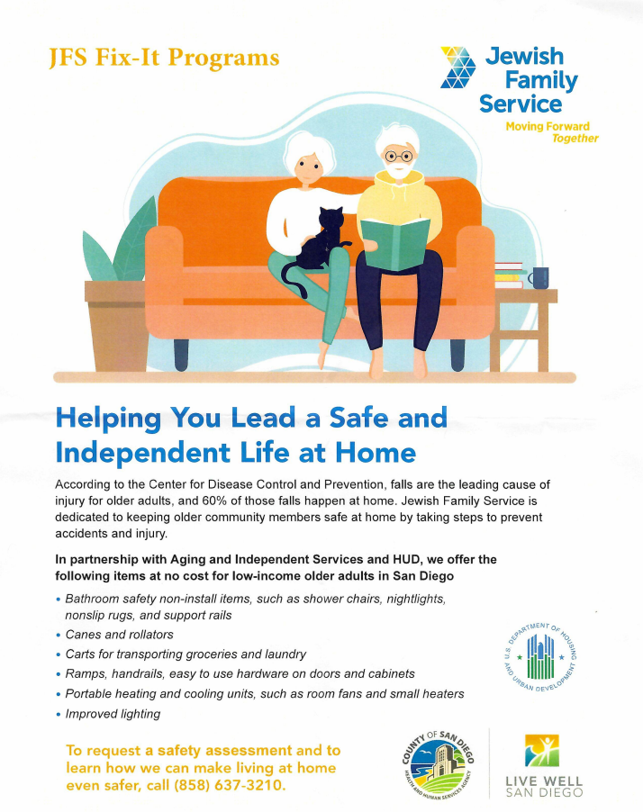 JFS Fix-It Programs offer free home-safety items and equipment to help low-income older adults in San Diego live safely and independently. Services include bathroom safety aids, mobility supports, ramps, lighting improvements, and more.