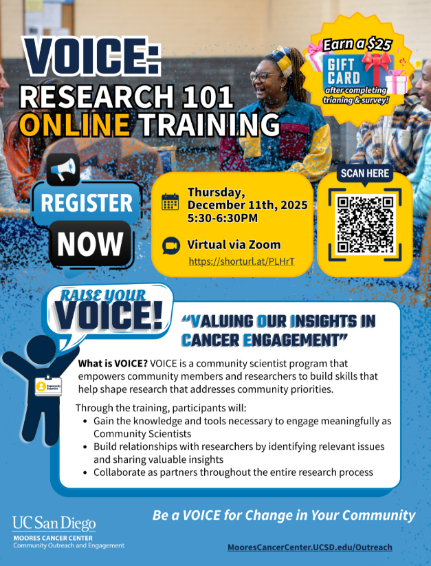 The training helps participants gain knowledge and tools, build relationships with researchers, and collaborate as partners in shaping research that addresses community priorities. Participants can earn a $25 gift card upon completion of both the training & survey. Hosted by UC San Diego Moores Cancer Center Community Outreach and Engagement.