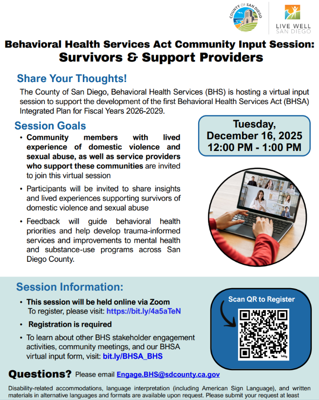 The County of San Diego, Behavioral Health Services (BHS) is hosting a virtual input session to support the development of the first Behavioral Health Services Act (BHSA) Integrated Plan for Fiscal Years 2026-2029.