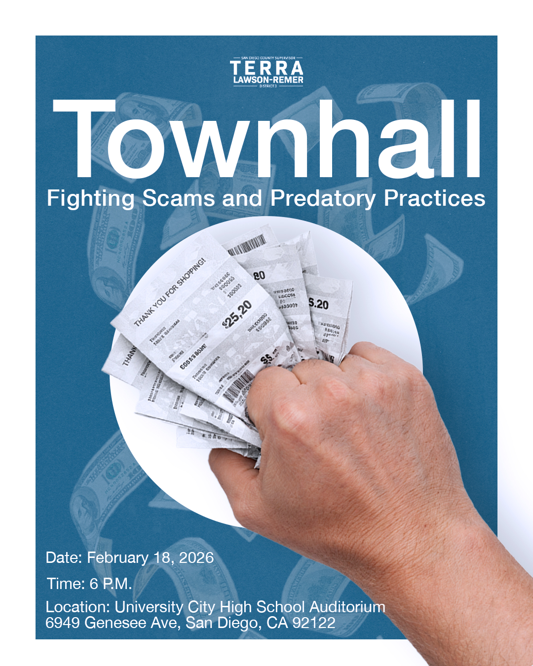 During this townhall, a variety of topics will be discussed such as common scams throughout San Diego, experiences that San Diego residents are facing within their neighborhoods, and an introduction to the Consumer Fairness and Public Protection Unit proposal.