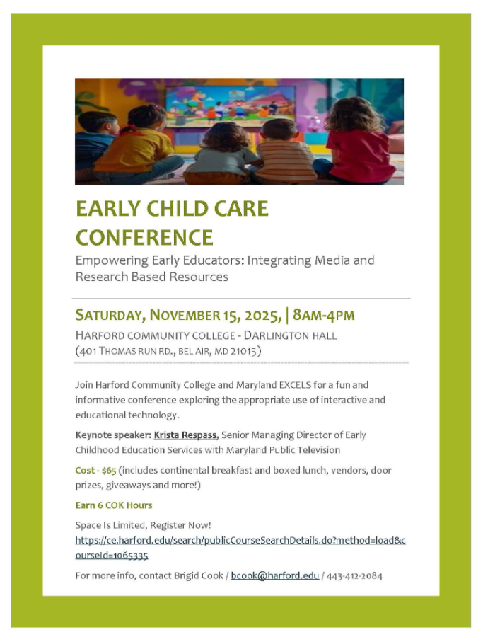 Join Harford Community College and Maryland EXCELS for at Empowering Early Educators: Integrating Media and Research Based Resources. Keynote speaker: Krista Respass from Maryland Public Television and three breakout sessions. 6 COK hours. November 15, 8:00 a.m.- 4:00 p.m. at Harford Community College