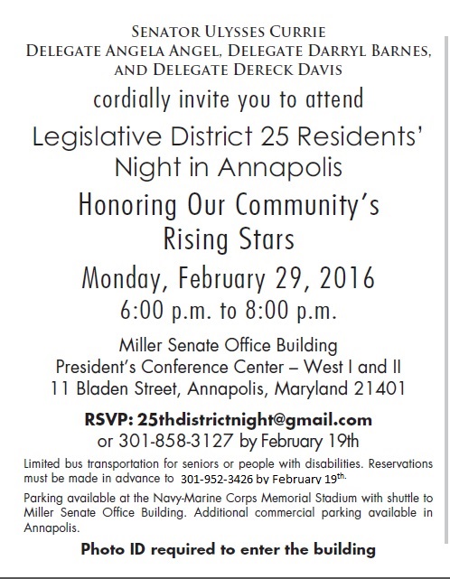 For more information or to RSVP, please e-mail 25thdistrictnight@gmail.com or call (301) 858-3127.