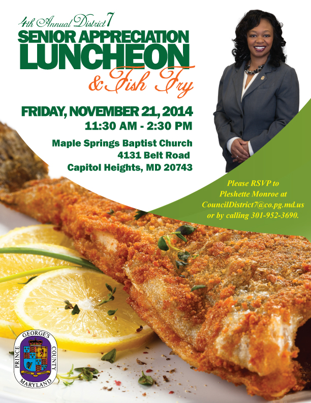 Council Member Karen R. Toles cordially invites you to attend the 4th Annual Senior Appreciation Luncheon and Fish Fry. The event will take place on Friday, November 21, 2014 from 11:30 am to 2:30 pm at Maple Springs Baptist Church in Capitol Heights, Maryland. For more information, see the flyer below or attached. To RSVP, contact Pleshette Monroe by calling (301) 952-3690 or sending an e-mail to councildistrict7@co.pg.md.us. You must be a resident of Council District 7 to attend.