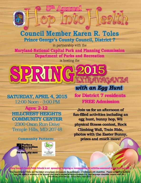 Council Member Karen R. Toles cordially invites you to the 5th Annual Hop Into Health Spring Extravaganza.  The event will be held at the Hillcrest Heights Community Center on Saturday, April 4, 2015 from 12:00noon to 3:00pm.  For more information, please see the flyer below and attached, or contact our office at (301) 952-3690.