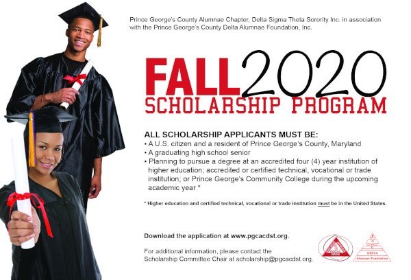 The Prince George's County Alumnae Chapter, Delta Sigma Theta Sorority, Inc., in association with the Delta Foundation (formerly known as the Prince George's County Delta Alumnae Foundation) offers an annual college scholarship program to help further higher education among students who are Prince George's County residents. Applications can be downloaded by going to: www.pgcacdst.org and clicking on Fall 2020 Fall Scholarships Available. Questions regarding the scholarships can be sent to: scholarship@pgcacdst.org.