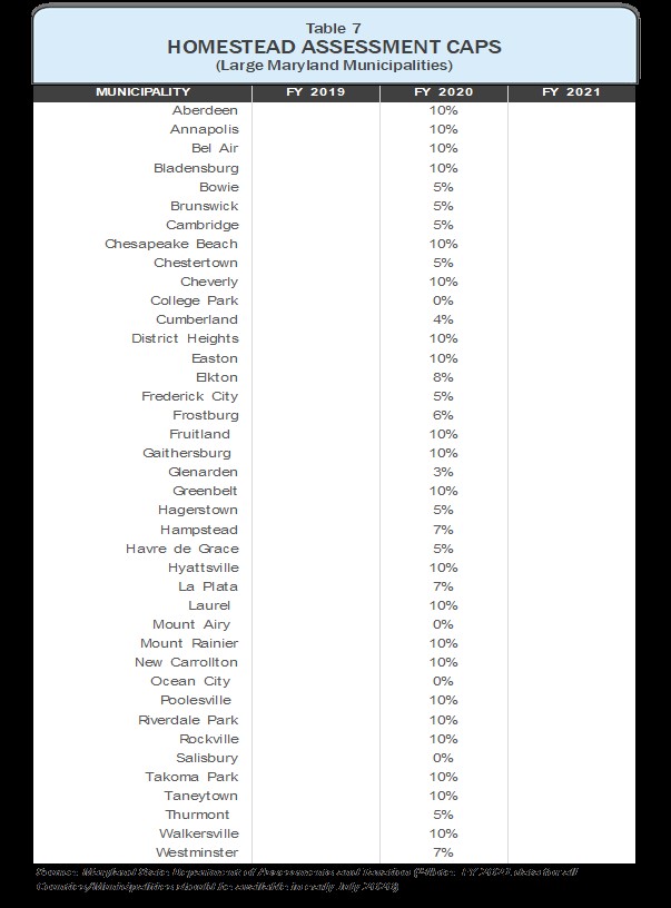 This table shows the most recent Homestead Assessment Caps for Large Municipalities in Maryland (population > than 5,000), including those in Prince George’s (including in Bowie, Greenbelt and District Heights, the only municipality in our Council District):