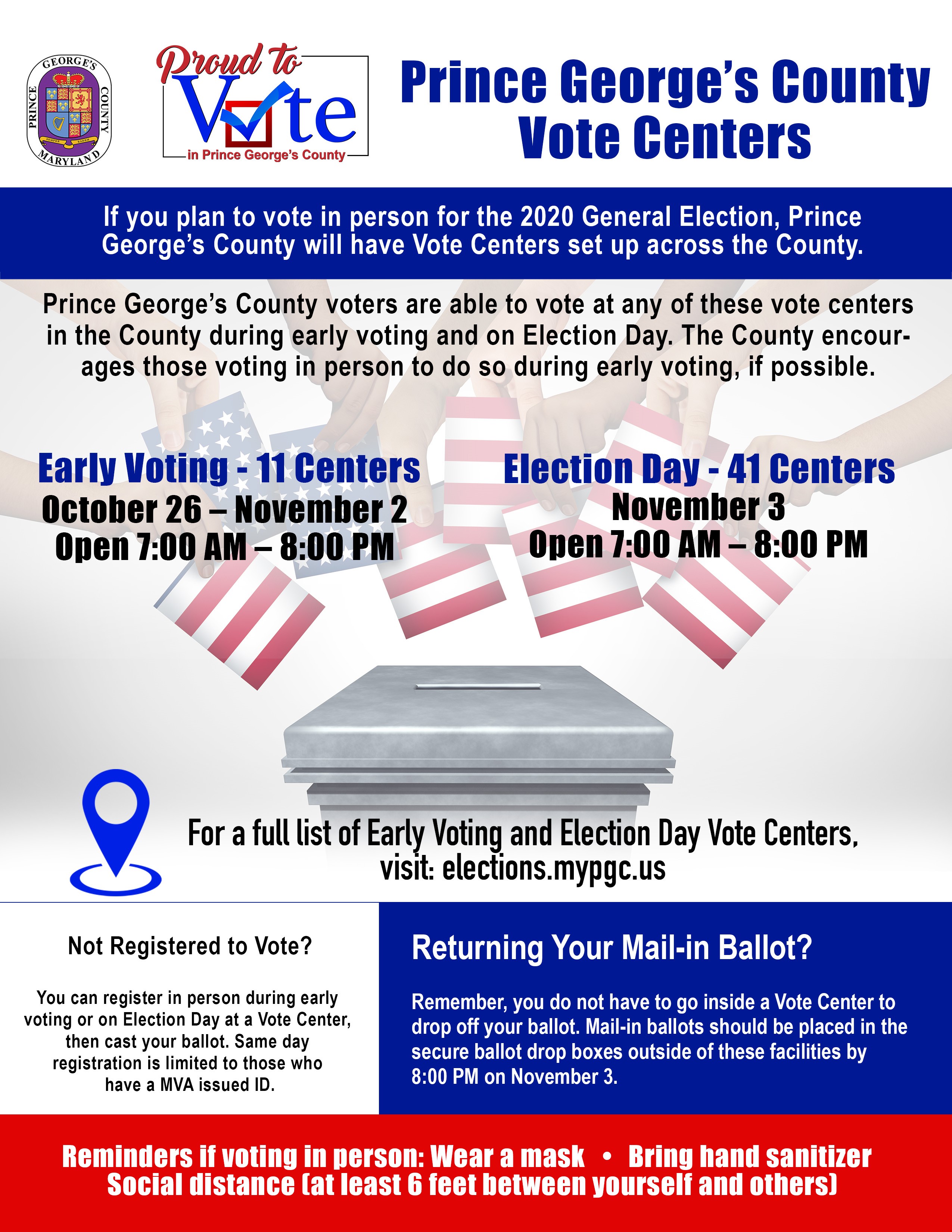 Although we strongly encourage you to vote by mail, you can vote in person at one of the Prince George’s County’s Early Voting sites on Election Day. If you choose to vote in person, please be prepared for long lines, wear a mask and socially distance yourself.