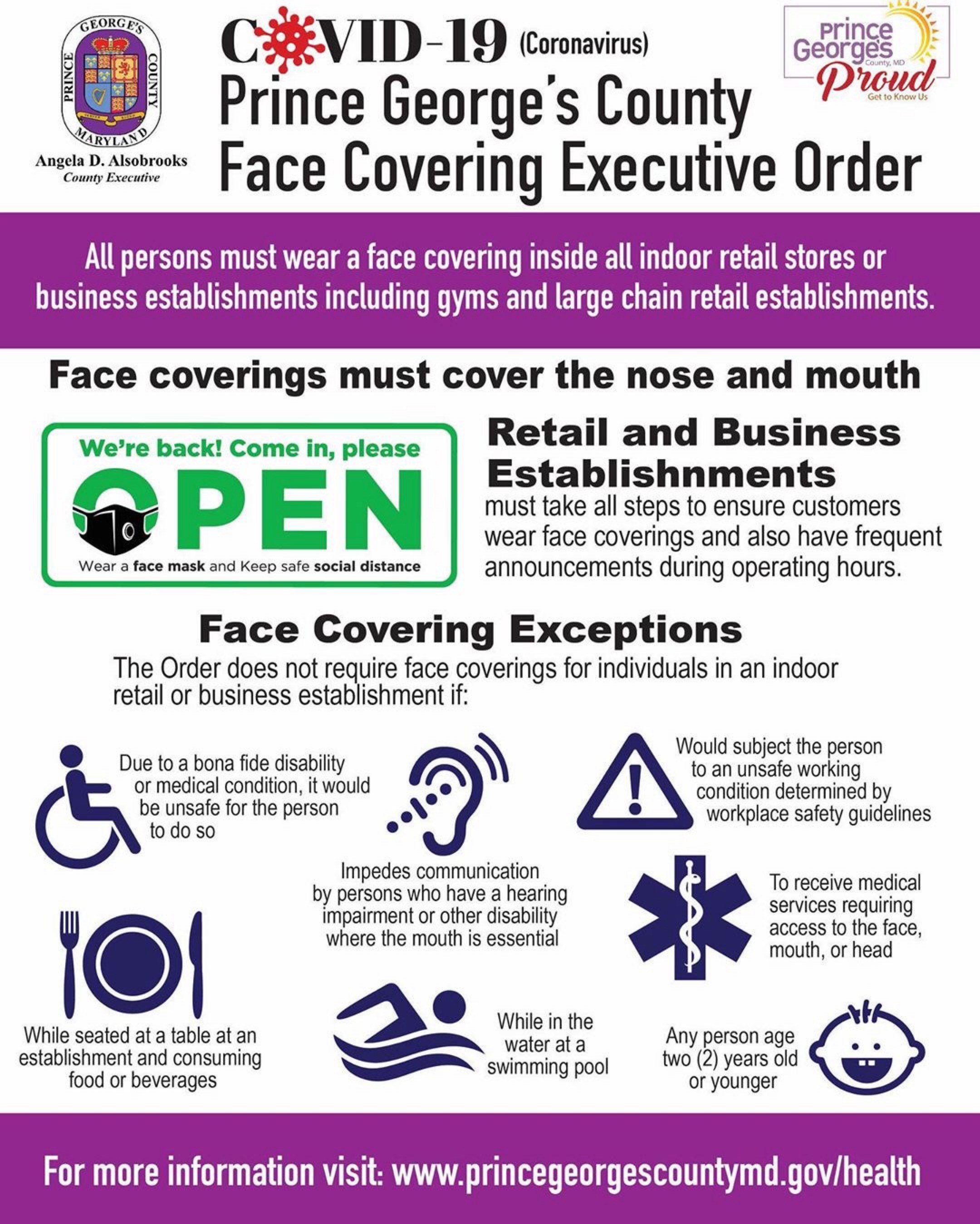 All County businesses with questions about whether they can open and how they can operate as Prince George’s County moves through its phased reopening, should send an email to Experience Prince George’s or call 311.