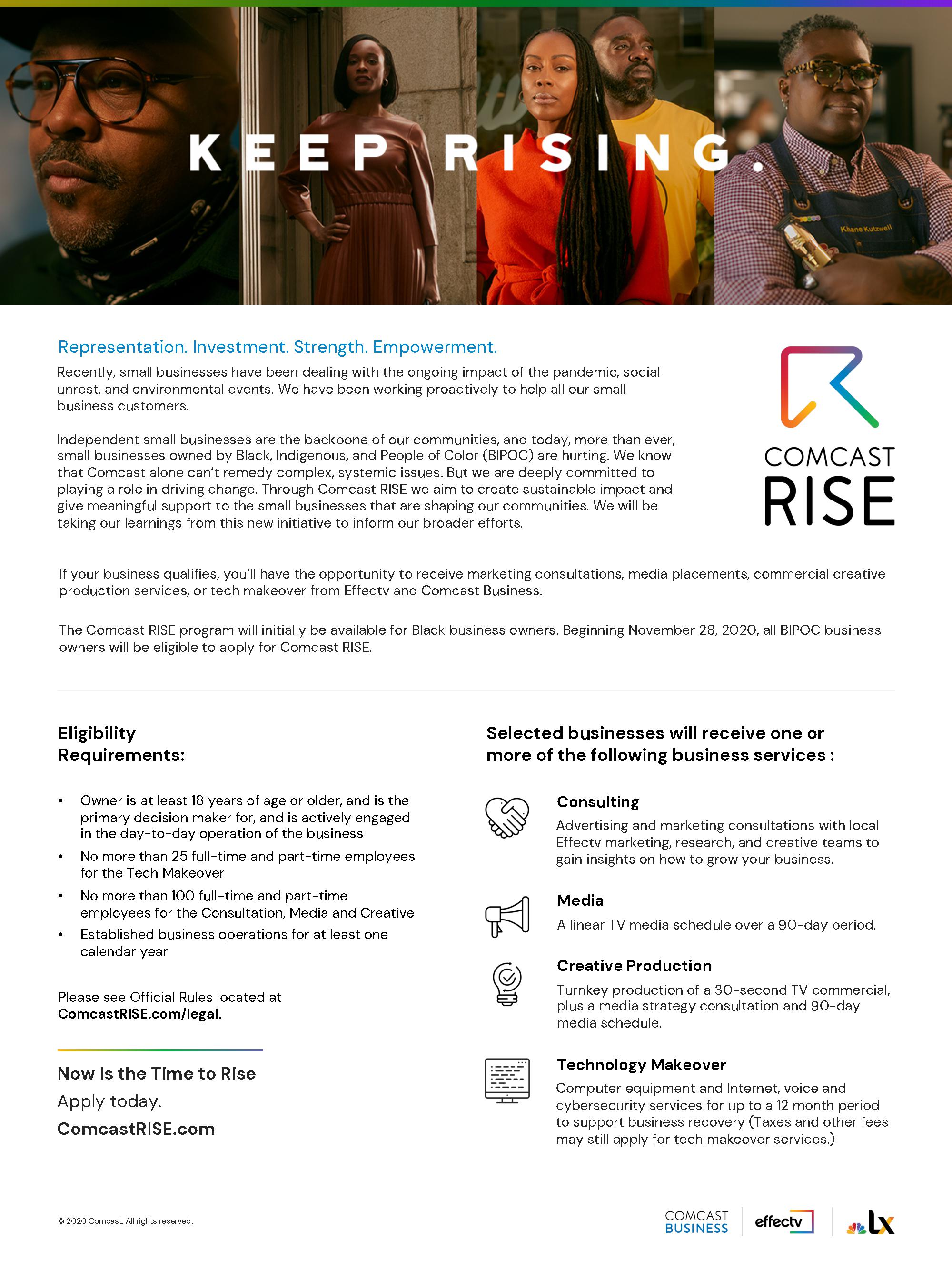 COMCAST has been working proactively to help its small business customers through its COMCAST Rise Program. Independent small businesses are the backbone of our communities, and today, more than ever, small businesses owned by Black, Indigenous, and People of Color (BIPOC) are hurting. Through the Comcast RISE Program, there is a goal to create sustainable impact and give meaningful support to the small businesses that are shaping communities.
