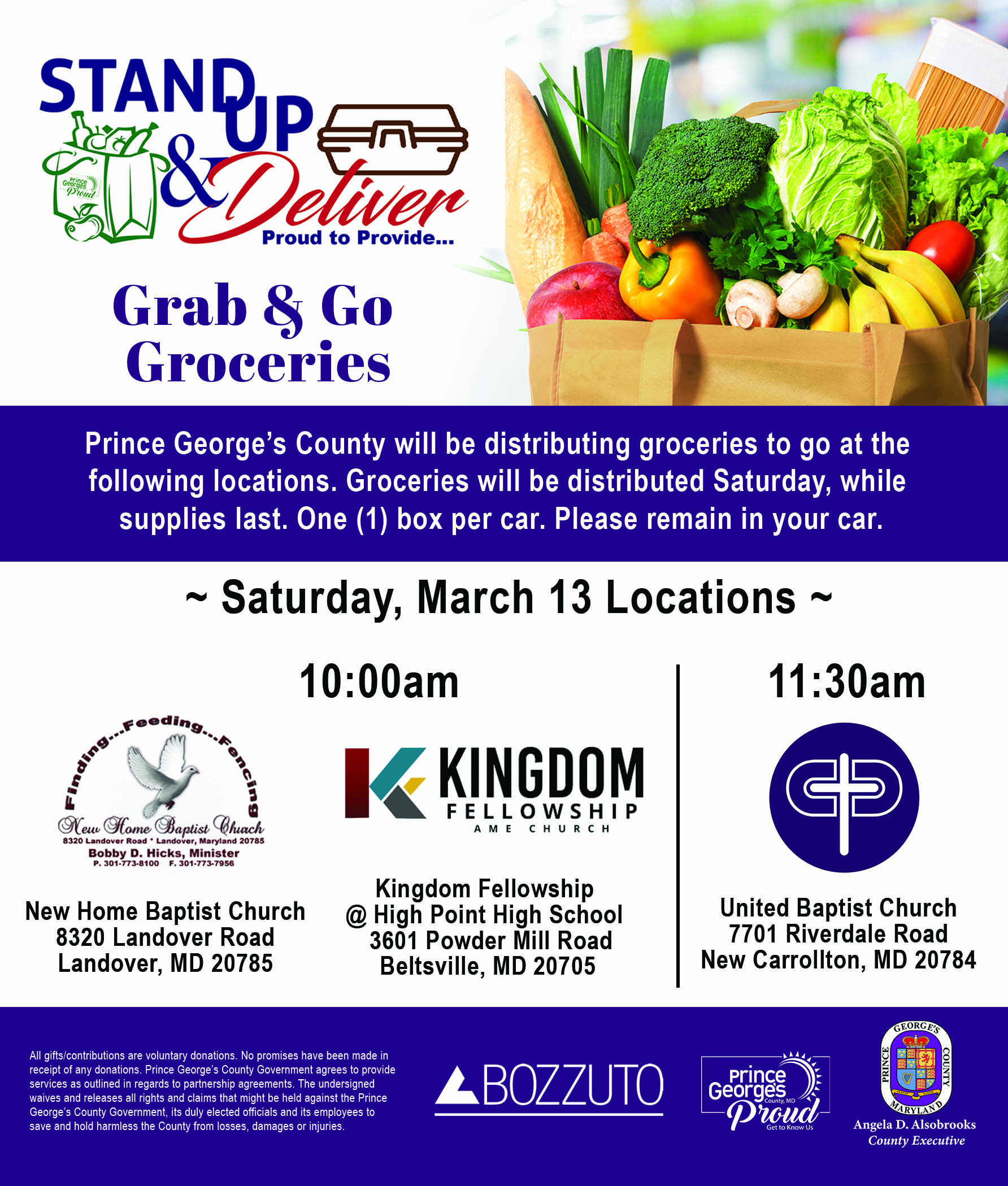 Through the County’s Stand Up & Deliver program, Prince George’s County will distribute groceries and meals to go today, Saturday, March 13 at multiple locations throughout the county.