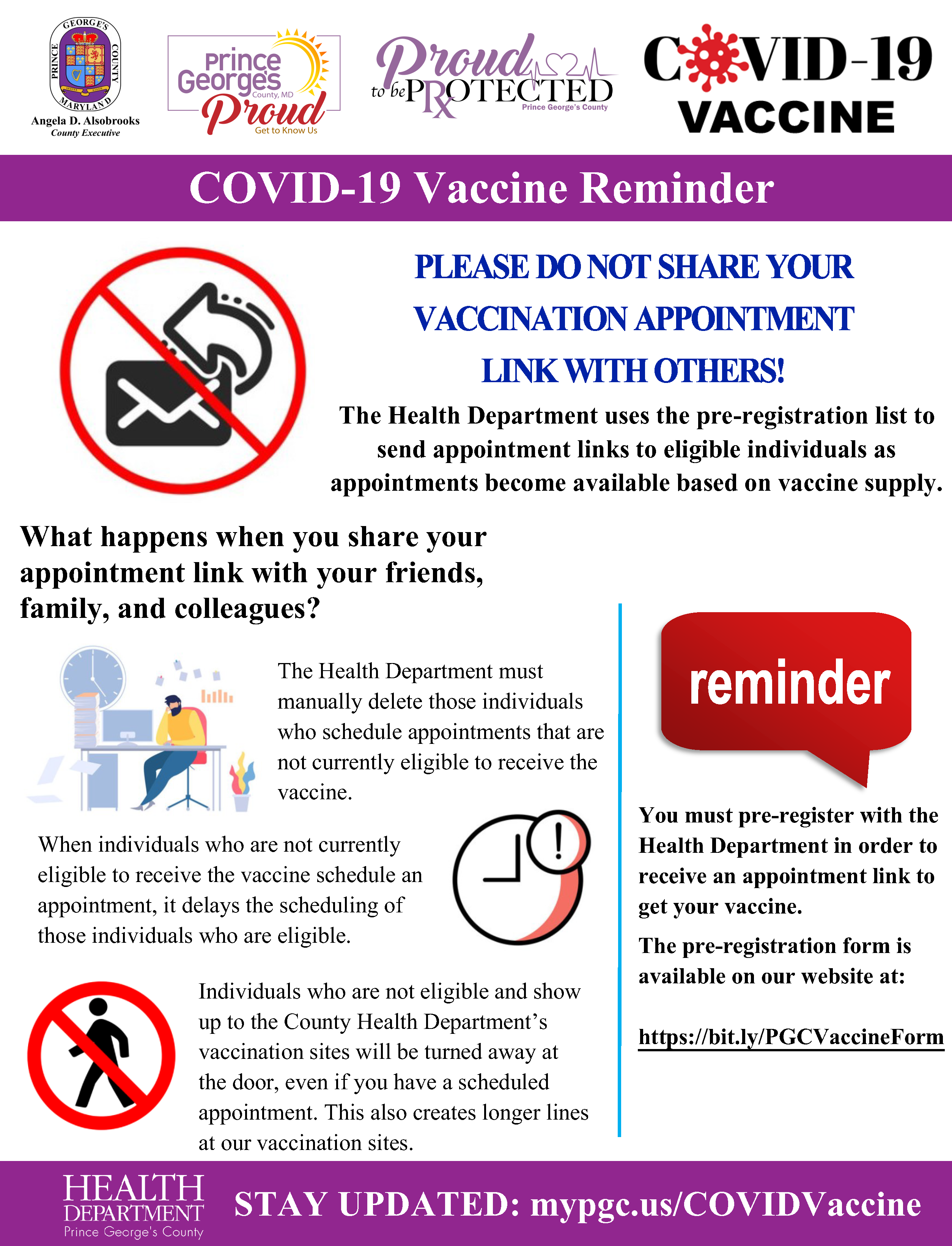 If you receive a COVID-19 vaccine appointment link from our County Health Department, please do not share that link with family, friends and colleagues.