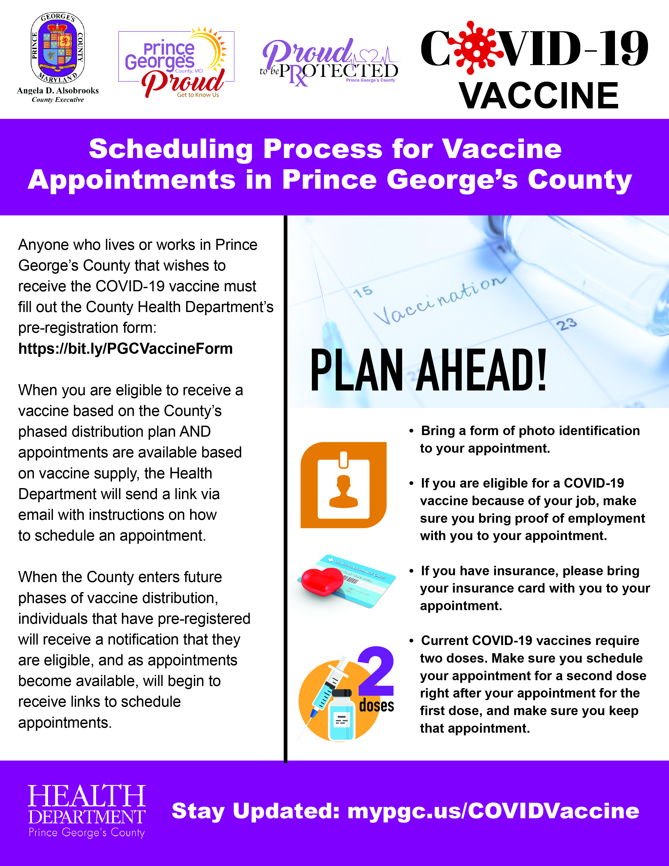 Anyone who lives or works in Prince George's County that wishes to receive the COVID-19 vaccine must fill out the County Health Department's pre-registration form: https://bit.ly/PGCVaccineForm.